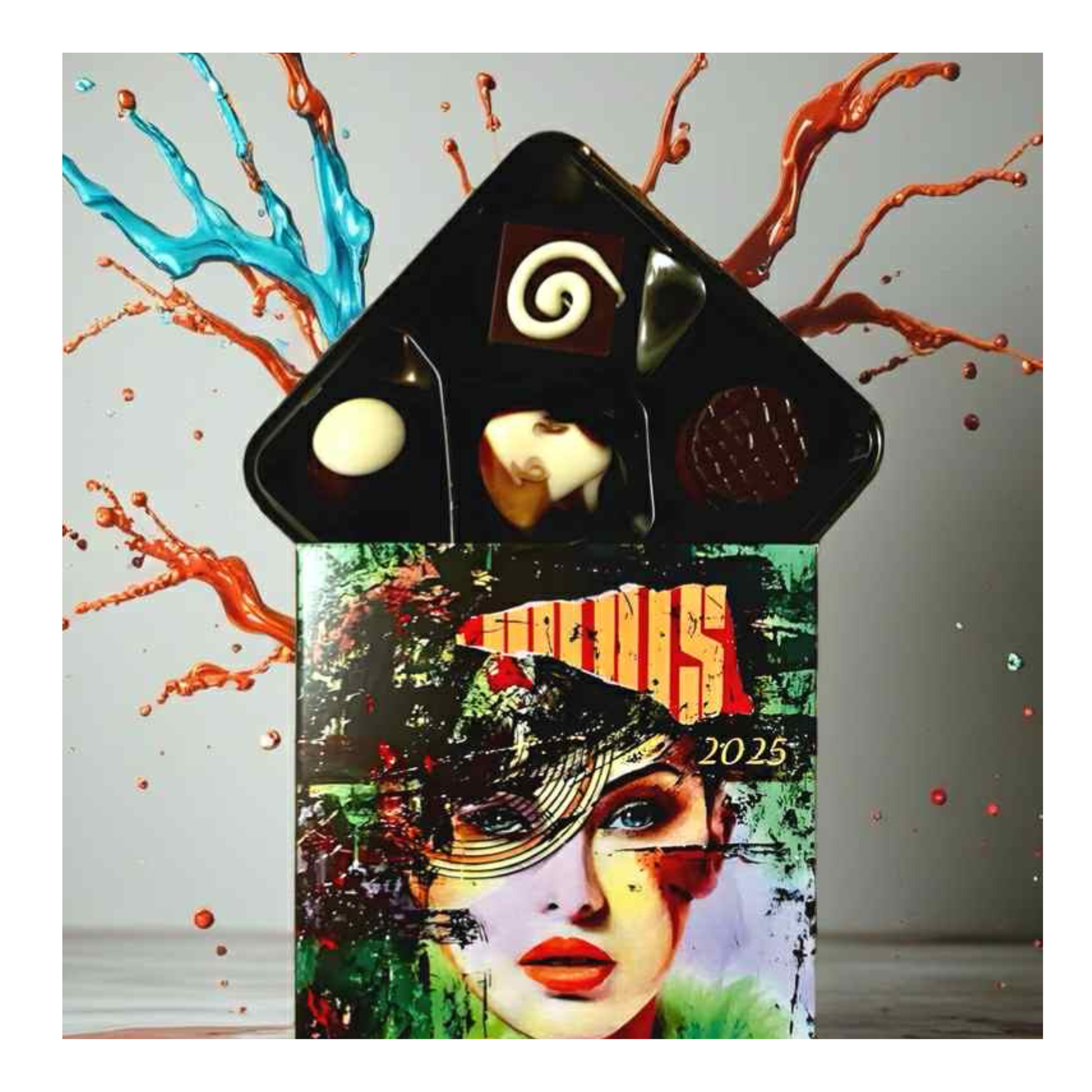 Hver eske er dekorert med Fru Bugges nyeste kunstmotiv, og blir dermed mer enn en sjokoladeeske – den blir et samlingsobjekt, en gave med wow-effekt, og et lite kunstverk i seg selv.