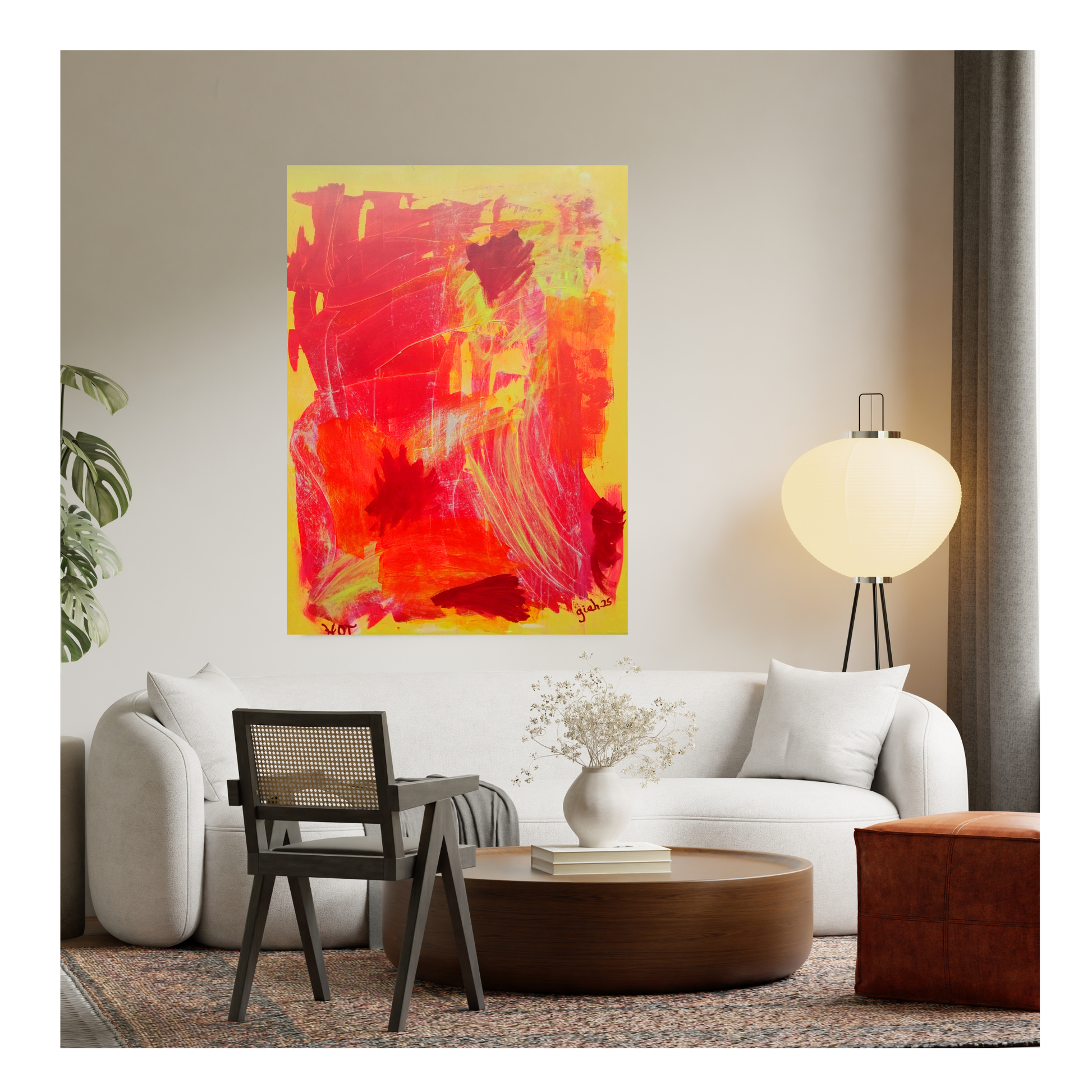 Dette energiske abstrakte maleriet stråler av varme, kraft og bevegelse. De sterke røde og oransje feltene danser over flaten som glødende lag av lys og varme, mens de mykere gule og neongrønne strøkene skaper rytme og dybde. Penselføringen er spontan, leken og intuitiv – full av liv, tekstur og umiddelbarhet.